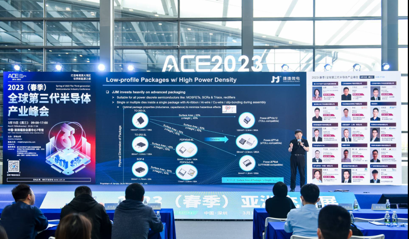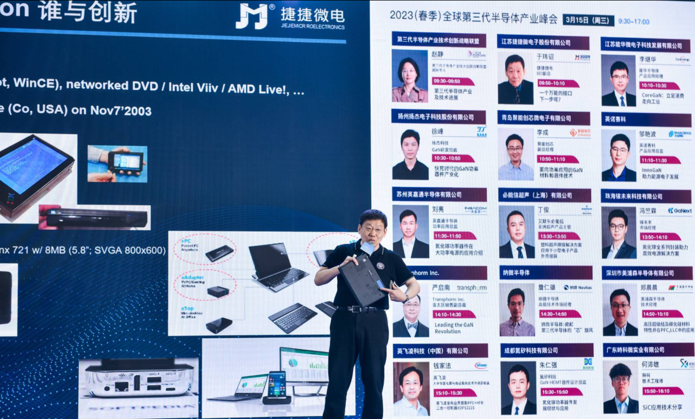 展會期間,捷捷微電業(yè)務(wù)拓展副總于瑋詔先生受邀出席全球第三代半導(dǎo)體產(chǎn)業(yè)峰會,以《一個萬能的接口,下一步呢?》為主題發(fā)表演講。介紹了捷捷微電近來來在快充領(lǐng)域的布局,如何為消費類電子提供更便攜、更安全的用電。并進一步指出移動 3C 終端的充電器越來越短小,有限的內(nèi)殼空間使工作溫度升高,造成充電器內(nèi)部所用器件的穩(wěn)定性和效能方面的要求極為嚴苛。捷捷微電自主研發(fā)的JSFET 及 JHFET 能輕松解決了電路設(shè)計工程師所面臨,合理成本和高電源轉(zhuǎn)換效率這兩個沖突的難題。